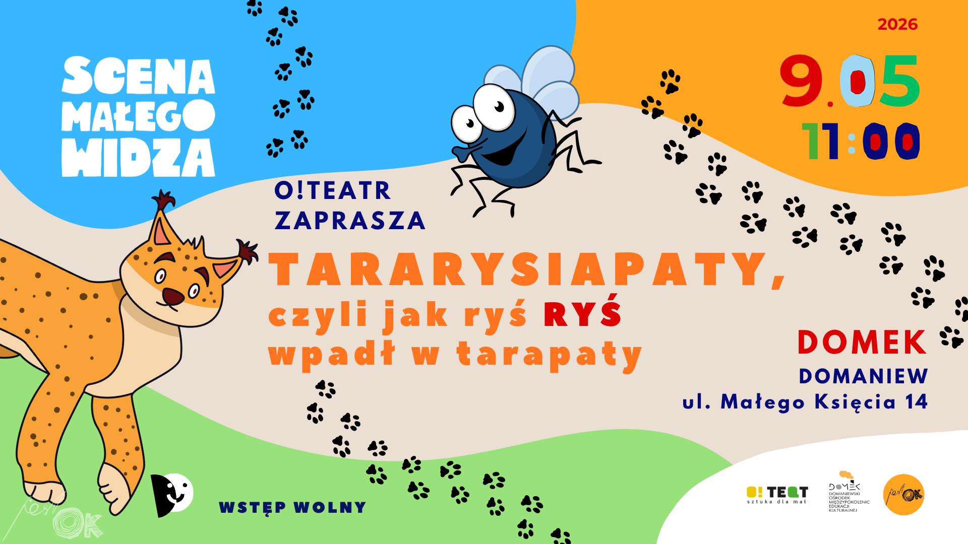 Zapraszamy na spektakl dla dzieci teatru O!Teatr pt. "Tararysiapaty czyli jak ryś Ryś wpadł w tarapaty"! ___ Ryś Ryś tym razem zawędrował o jeden strumyk za daleko. Opuścił las i pierwszy raz napotkał ślady obecności przedziwnego stworzenia jakim jest... człowiek.